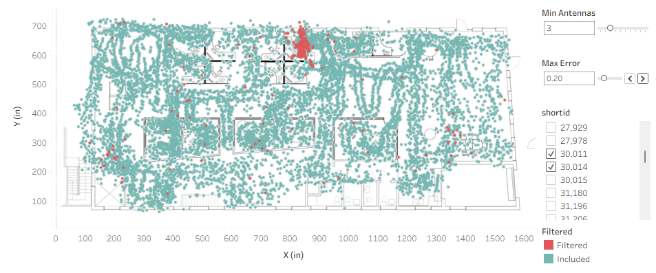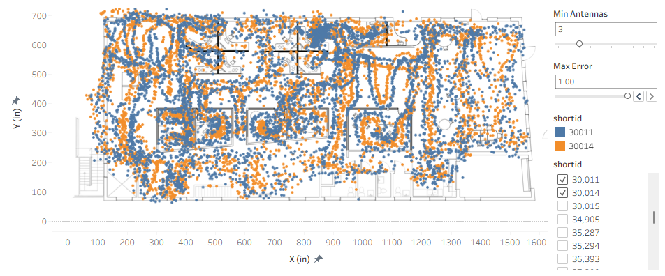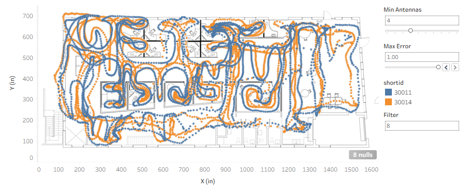 And what was going on at the left side of the office? An Antenna has been moved, so the initial automatic calibration no longer matches reality. It is sometimes possible to successfully track with Antennas in the wrong location, and even though the statistics are good, it is obviously not ideal. We want to correct the antenna problem as soon as possible to get good quality location data. For that, we have a separate diagnostic system, the Mesh Monitor, to alert on these kinds of issues. We will cover that in a later blog post.