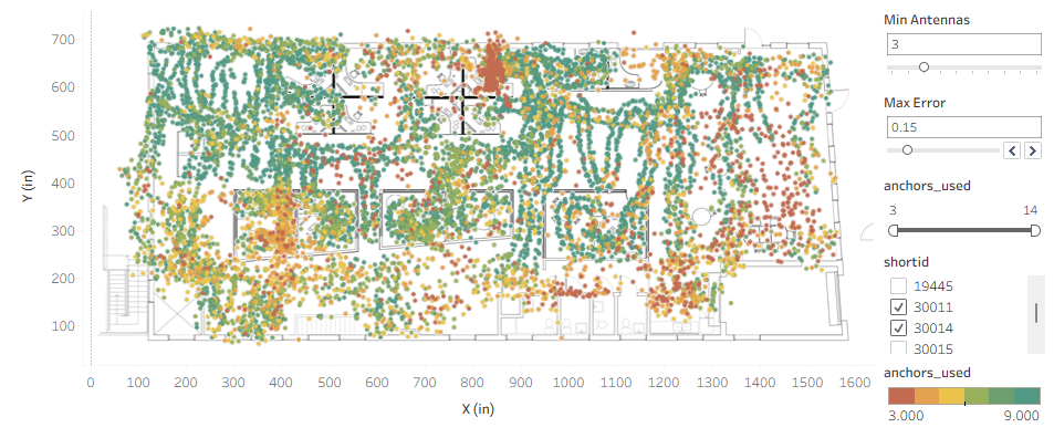 Coloring our raw locations by number of Antennas, we see the right side of the office does not have sufficient Antenna coverage for high accuracy.